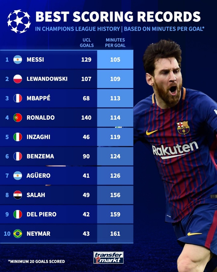 03月11日讯 德国足球转会市场统计并列出了欧冠历史上,所有至少打进20球的球员中,每球平均用时最短的球员前十。梅西以平均105分钟一球排名第一,莱万、姆巴佩排名前三。